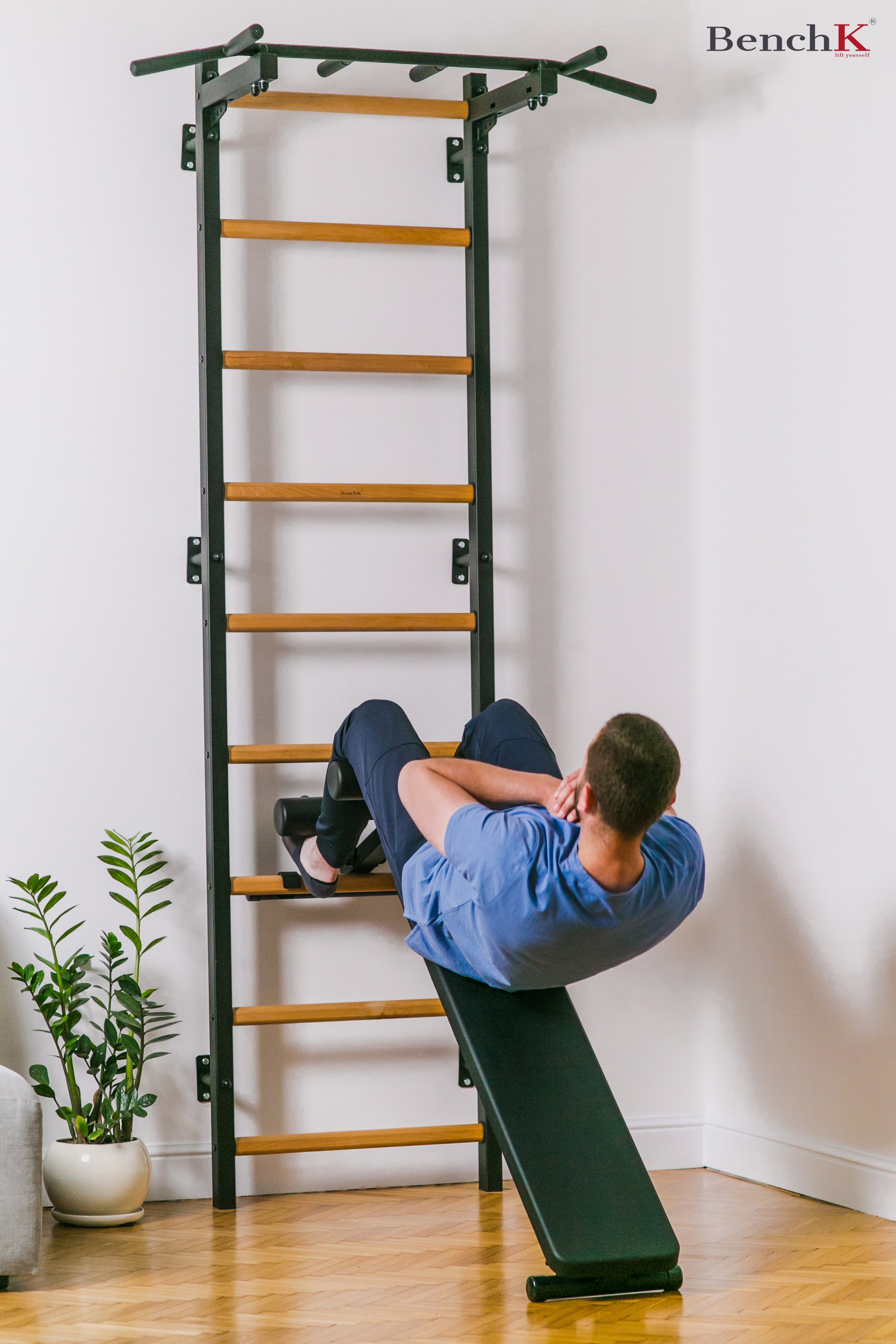 BenchK wall bars provide a full bodyweight workout with a wide range of exercise options - spine flexion and extension, joint mobility, strength training, core conditioning, stretching, handstands, cardio, straps, and many more.